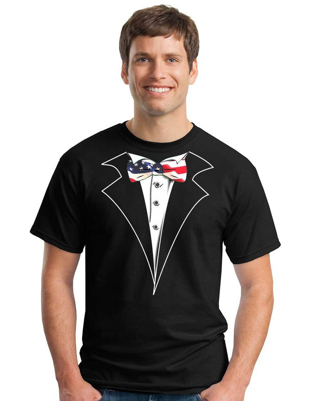 Tuxedo t-shirt with a USA flag tie on a Black 100% preshrunk cotton tee.