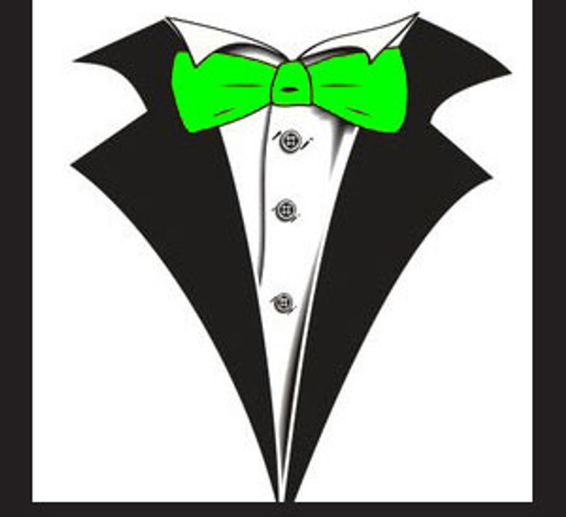 Tuxedo t-shirt with a neon green color bow tie on a White 100% preshrunk cotton tee. seamless collar, double needle stitched. taped shoulder to shoulder. Wearing a tuxedo t-shirt makes a statement about not taking life too seriously. Words to live by - "I like to be formal, but I am here to Party"